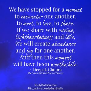 We have stopped for a moment to encounter one another, to meet, to love, to share. If we share with caring, lightheartedness and love, we will create abundance and joy for one another. And then this moment will have been worthwhile. ~ Deepak Chopra, The Seven Spiritual Laws of Success